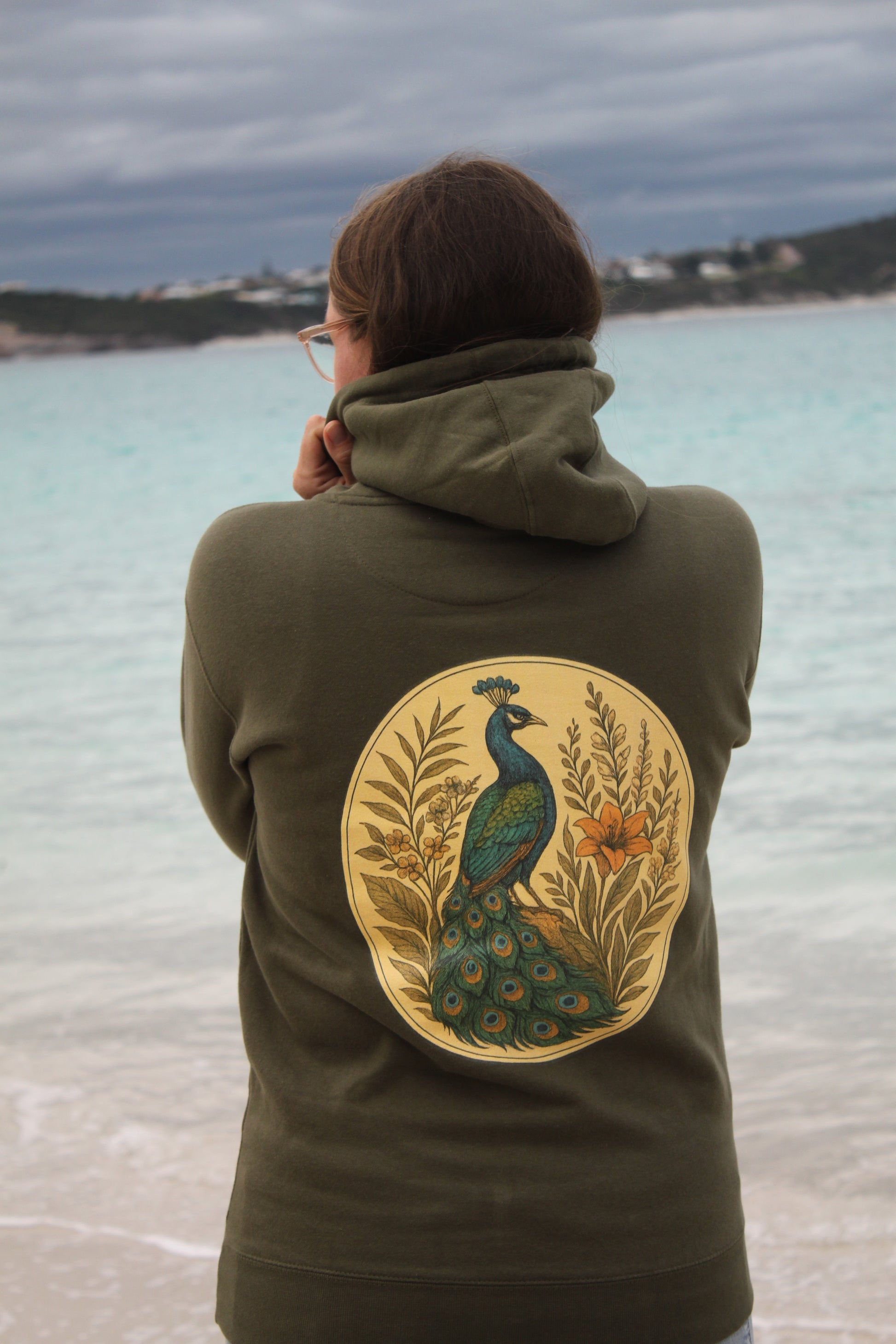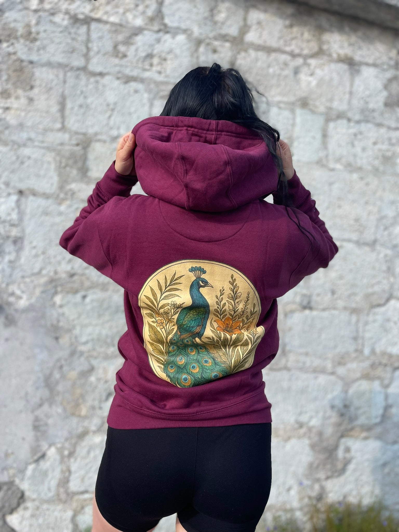 The 'Whisper Of Grace' hoodie features a delicate peacock, a timeless symbol of renewal, inner beauty and soulful pride. Designed to wrap you in comfort and inspire strength from within, because your softness is your superpower.